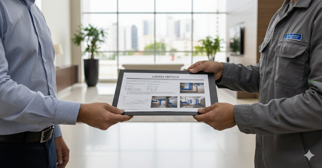 - Laudos Técnicos Profissionais: Documentação fotográfica e técnica detalhada, essencial para acionar o seguro do condomínio ou para mediar conflitos de responsabilidade entre condôminos (vazamento da unidade de cima para a de baixo).