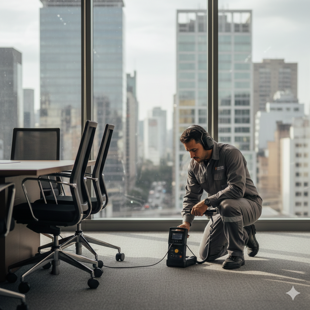 1. A detecção pode ser feita em horário comercial em escritórios? Sim. Nossos equipamentos são discretos e o processo de detecção é silencioso, permitindo que a rotina do escritório continue normalmente na maioria dos casos.